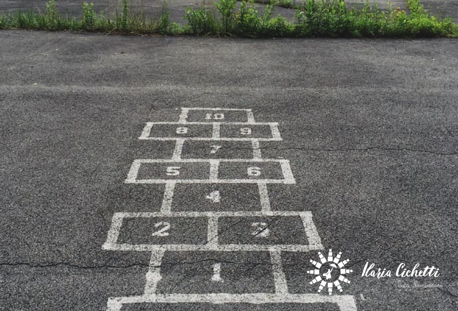 Occorrente: un gesso e un sasso, anche una corda se volete. Te lo ricordi?! Il gioco con i gessi a terra dove segnavi i numeri a terra e saltavi con un piede solo? Ai bambini piace moltissimo anche oggi. Se è troppo piccolo ed ancora non riesce a farlo da solo, saltate insieme a piedi uniti. È un gioco con origini antichissime e che simboleggia anche il percorso nel trovare sé stessi, separarsi per poi ritrovarsi. Per allenare il salto potete anche disporre una corda leggermente sollevata da terra e vi divertite a saltare di qua e di là.